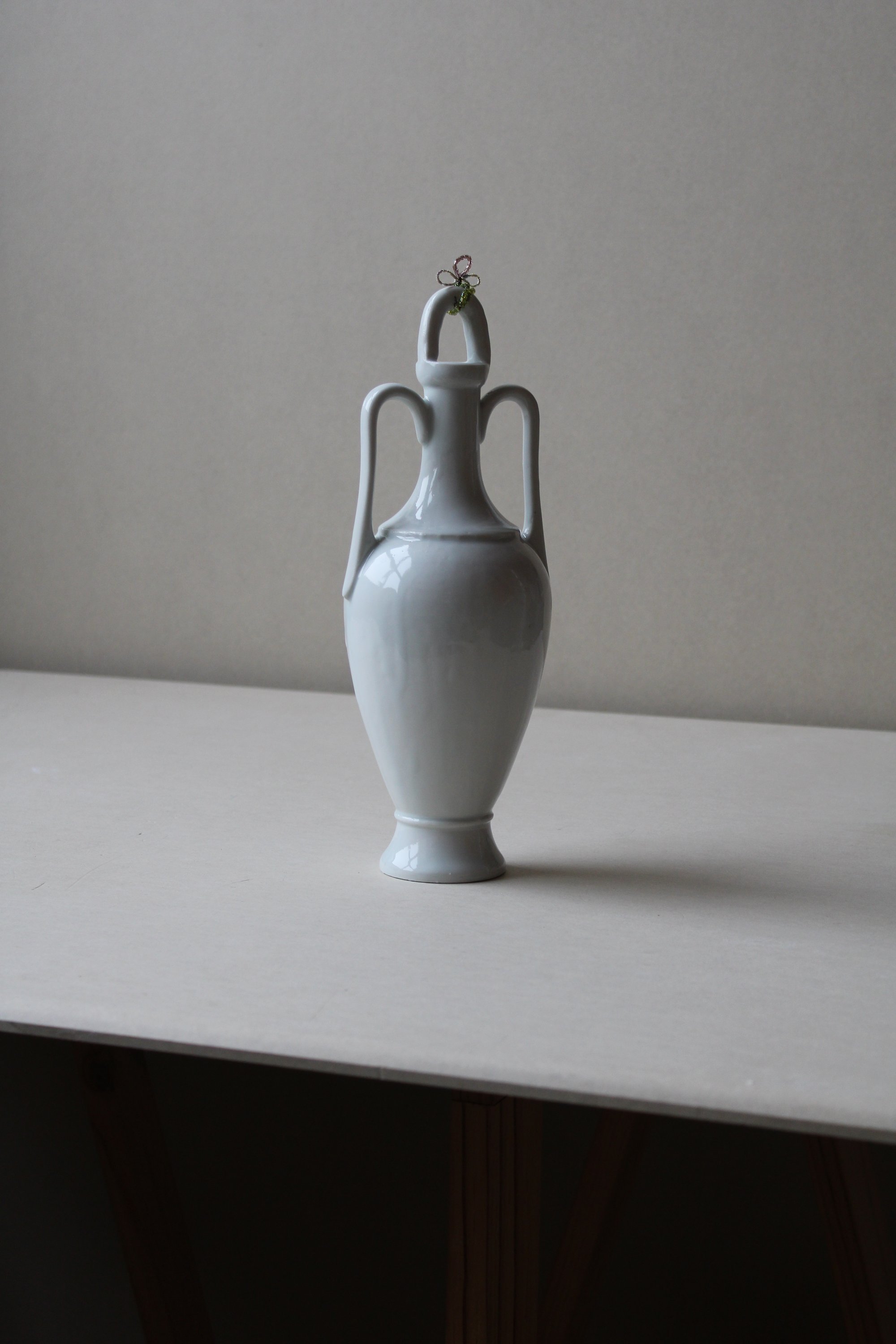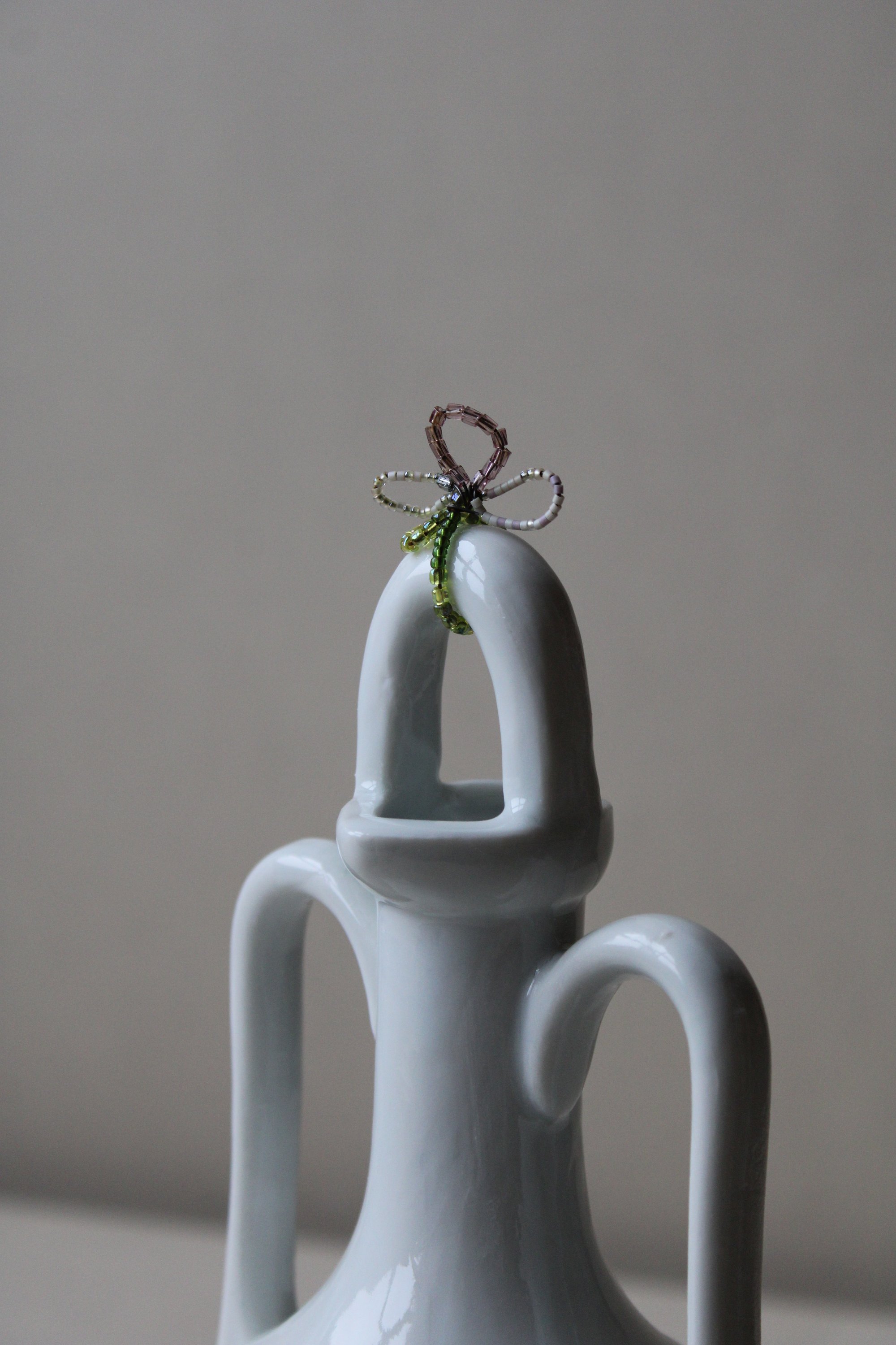matériaux/ porcelaine coulée dans des moules datant des années 1970 de la fabrique de porcelaine de Limoge + émail blanc brillant + perles en verre, vert rose et beige. cuisson haute température.